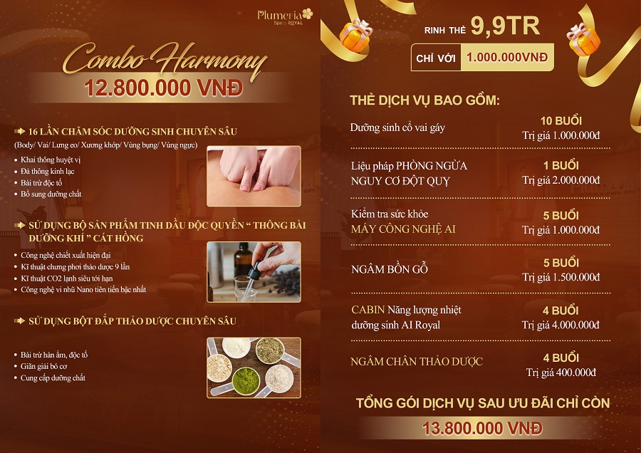 Plumeria Spa by Royal chính thức ra mắt Combo Harmony với ưu đãi hấp dẫn, mang đến cơ hội sở hữu thẻ 9,9 triệu chỉ với 1.000.000 đồng.